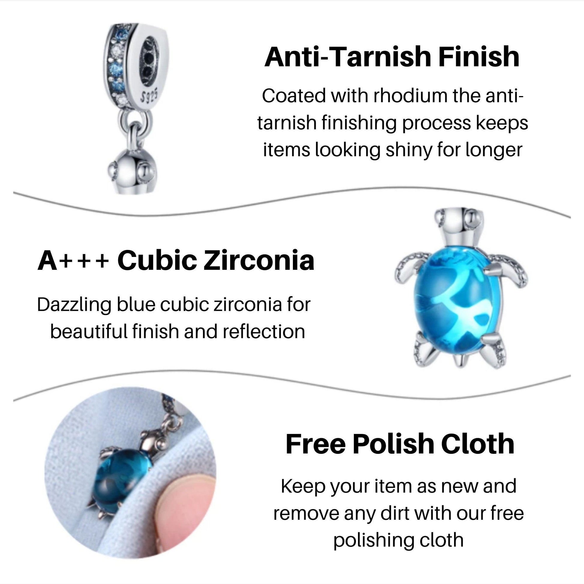 This Blue Turtle Dangle Charm is a cute little fella, with a central dazzling sea blue stone for its entire body. This turtle will definitely stand out on your charm bracelet. Detailed beading is found on his tiny fins and tail, with a scale-like design on his belly. This charm is crafted with 925 sterling silver and finished with anti-tarnish rhodium. The dangle circle is encrusted with blue and clear cubic zirconia stones to add a dash of sparkle and continue with the sea-style colouring.