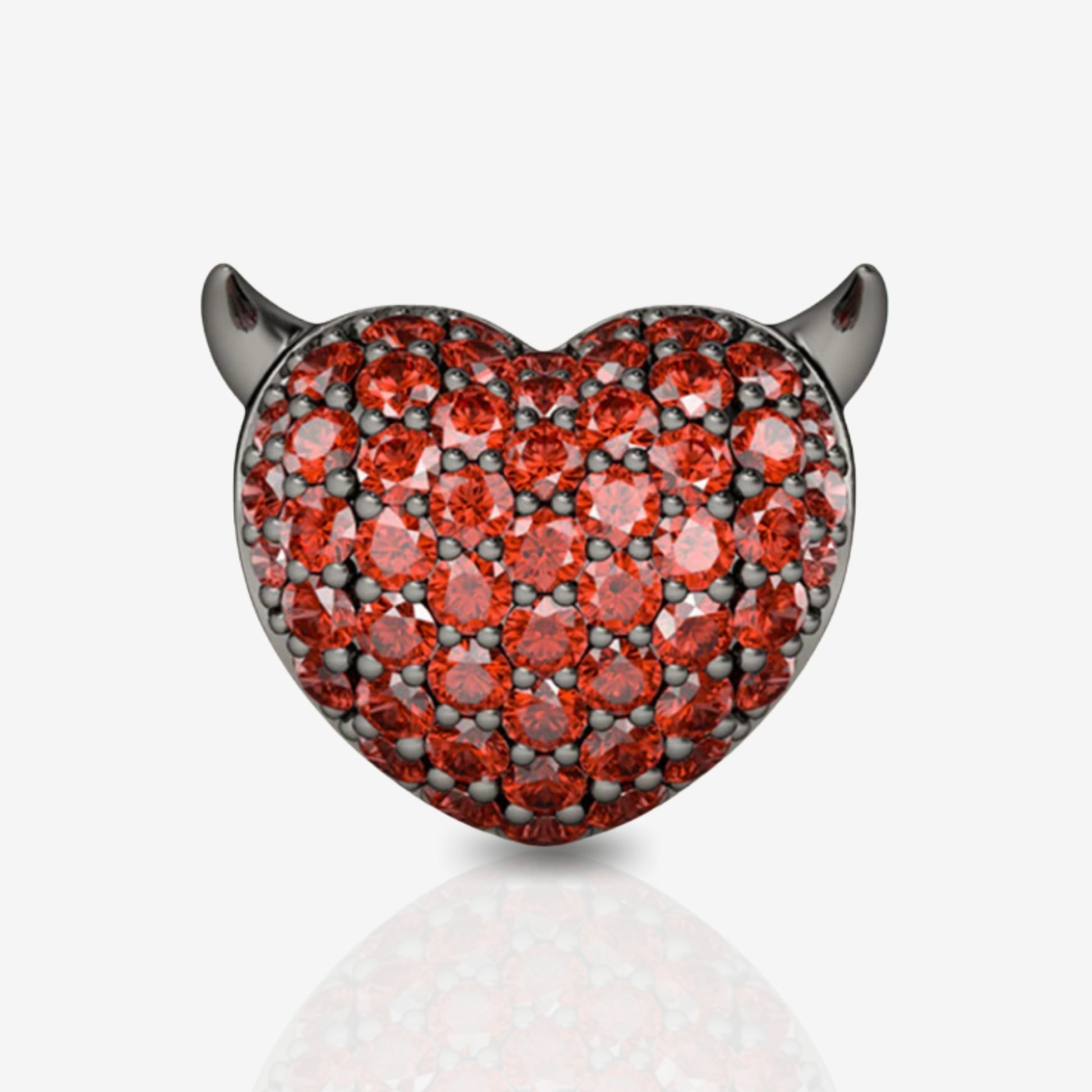 This cute little devil is made from S925 sterling silver and coated with shiny black enamel, encrusted with dark red CZ stones on either side, completed by 2 little devil horns and heart-shaped cut-outs around the sides.