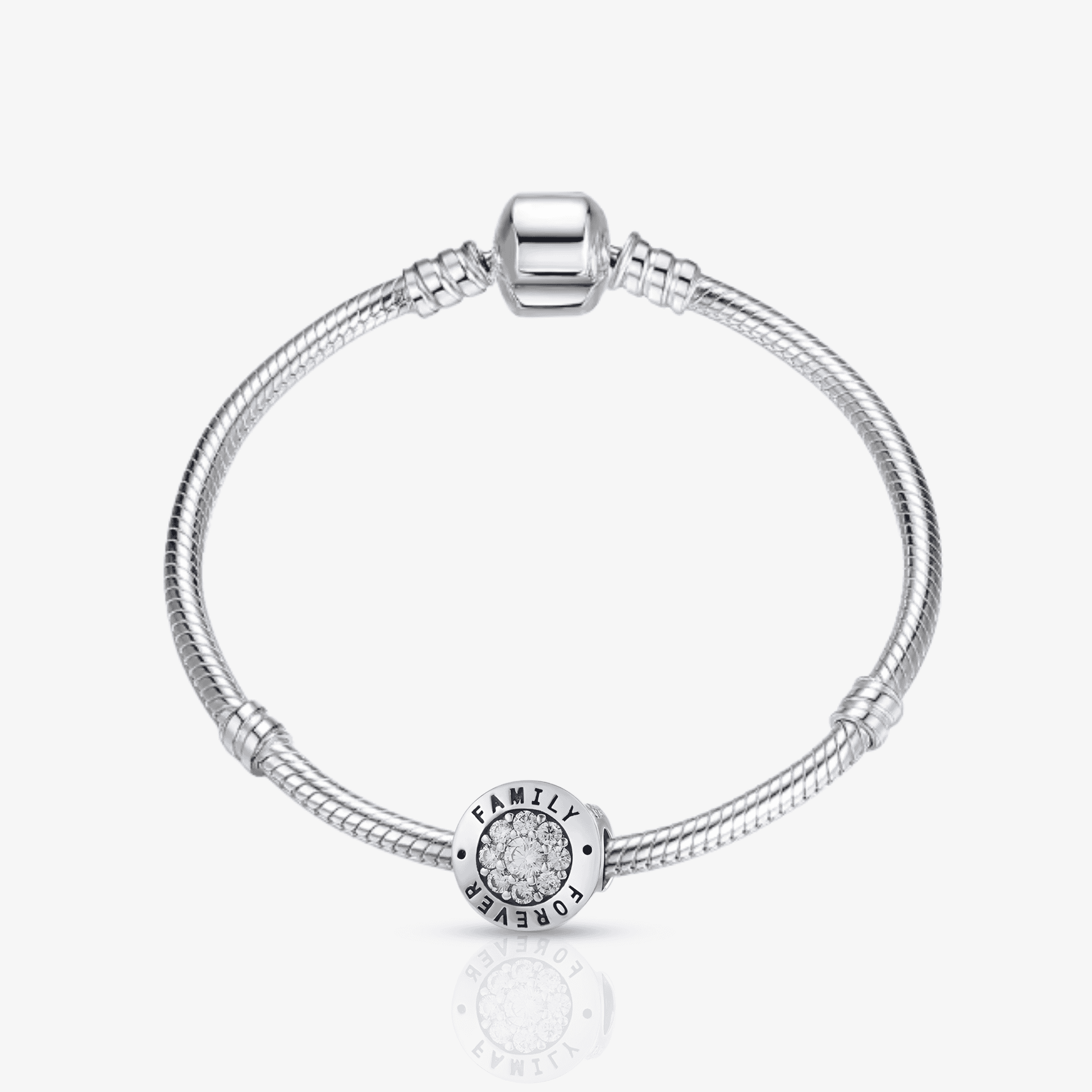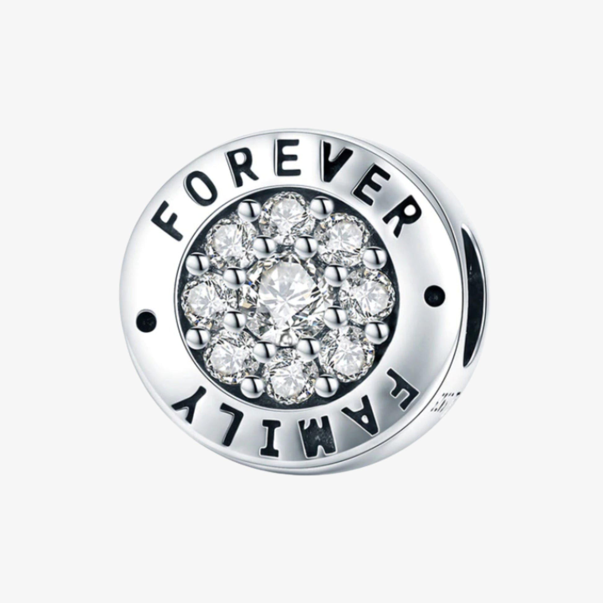 This Family Forever Circle Charm is crafted with an exquisite glistening circle of clear cubic zirconia stones, set within a high-quality sterling silver casing. Engraved on each side is the phrase "family forever", making this charm a meaningful, timeless keepsake for your loved ones.