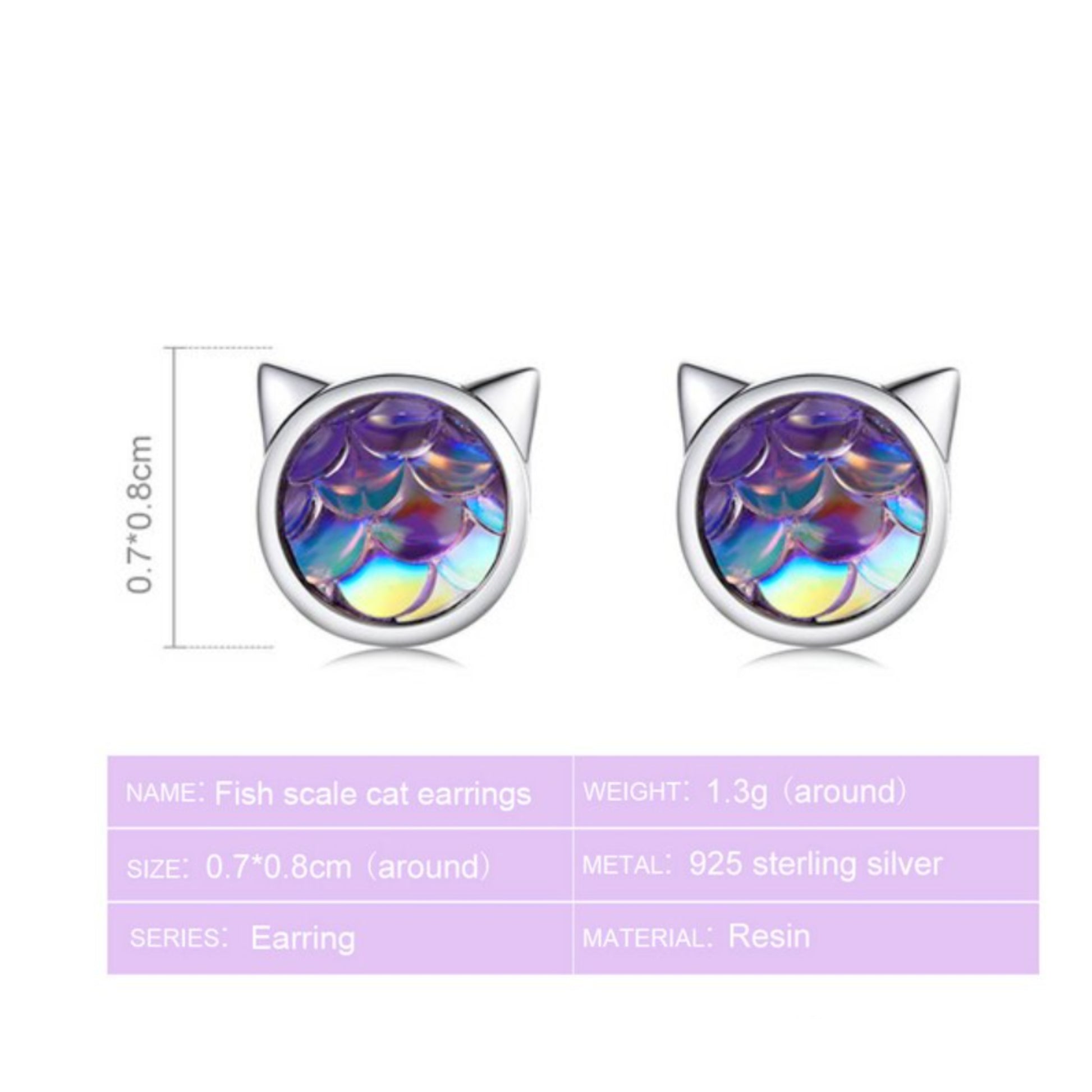 These small but cute Fish Scale Cat Earrings will definitely catch the light and glimmer on your ears. Crafted with sterling silver the outline resembles that of cat ears, whilst the inner design made with resin is made to look like reflective fish/mermaid scales.