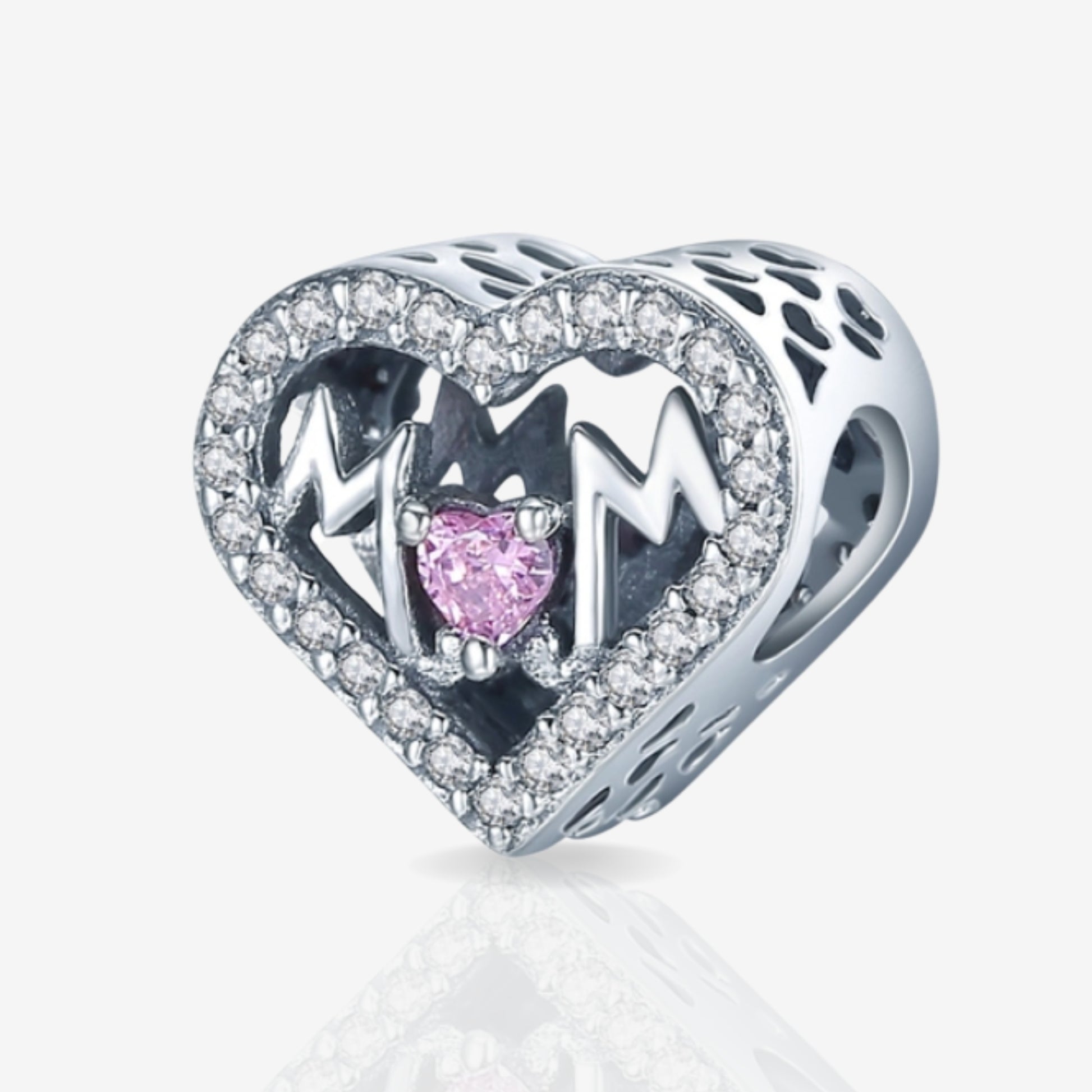 This meticulously crafted Mum Heart Charm with Sparkle Outline is a perfect way to honour the special bond between a mother and her child. Crafted from sterling silver, this charm is heart-shaped with the word mum delicately displayed in its middle, joined by a shimmering pink heart completing the U.