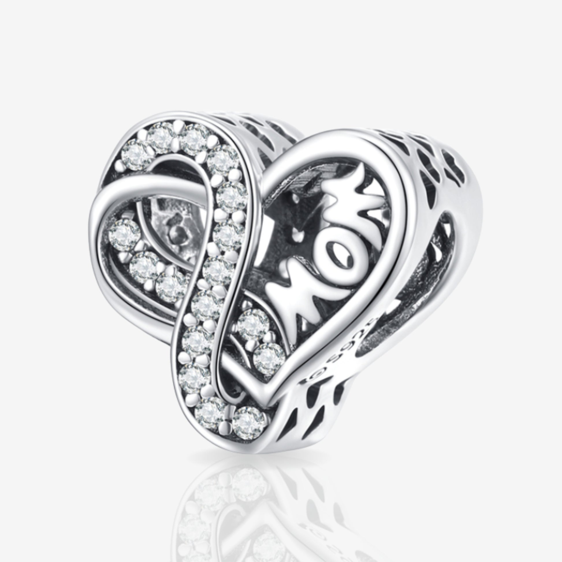 This beautiful sterling silver charm is handcrafted with a luxurious finish. The heart shape is adorned with the infinity-shaped sparkle of clear cz stones and "mom" delicately etched into the openwork. The sides are decorated with small cut-out hearts for an extra special touch.