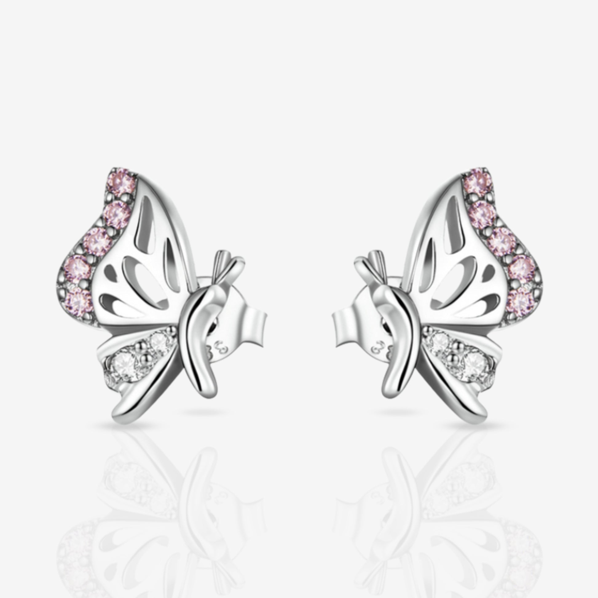 Fly away in style with these show-stopping Sterling Silver Butterfly Stud Earrings! Add a touch of sweetness to any look with the pretty pink pave CZ stones on the top wings and sparkle with the clear CZ stones on the bottom wings.